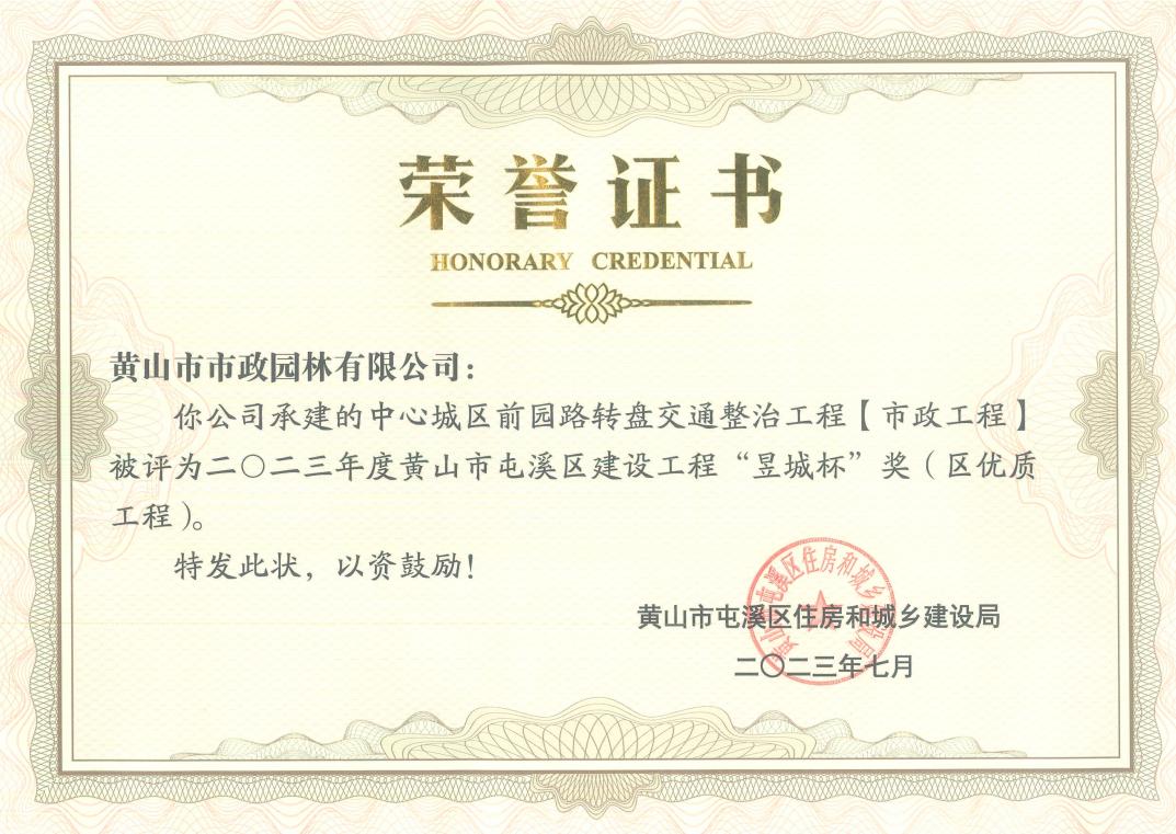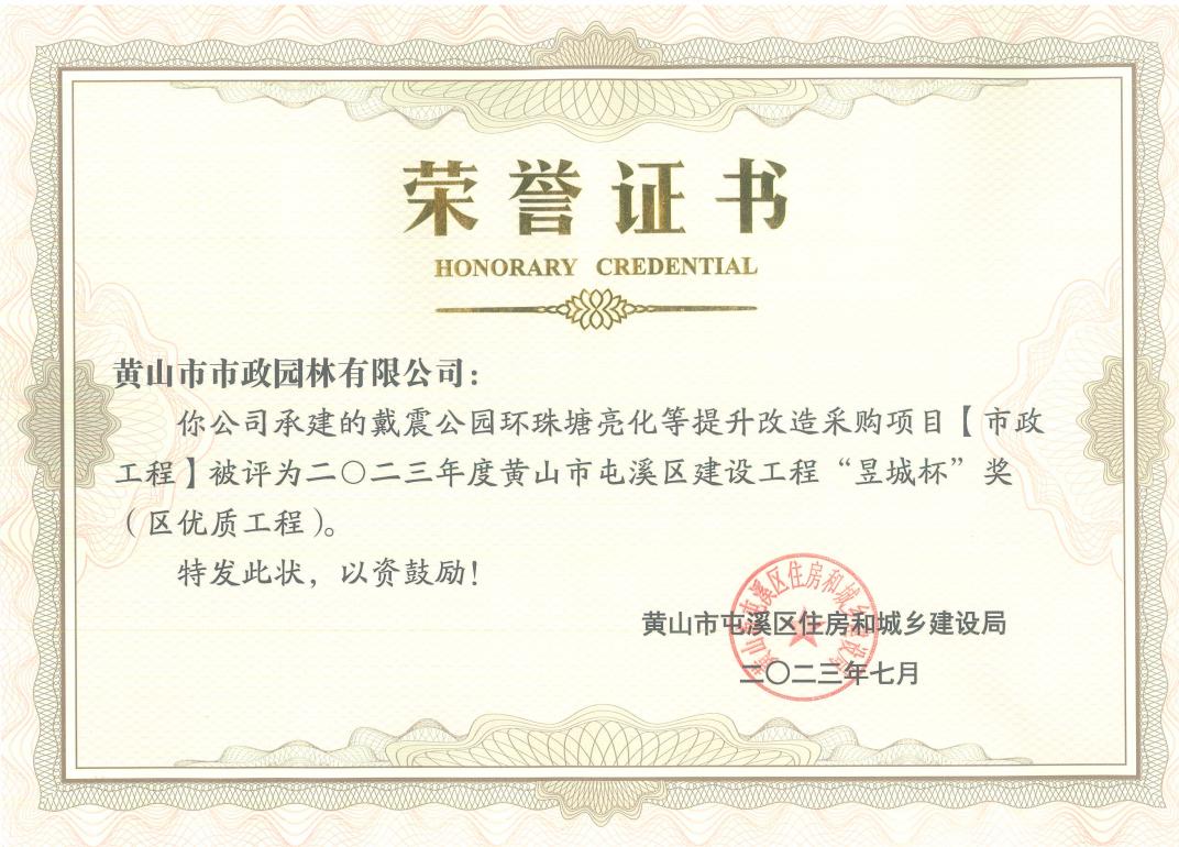 近日,屯溪區(qū)住建局公布了2023年度屯溪區(qū)建設(shè)工程“昱城杯”(區(qū)優(yōu)質(zhì)工程)表彰名單,市政園林公司承建的中心城區(qū)前園路轉(zhuǎn)盤交通整治工程和戴震公園環(huán)珠塘亮化等提升改造采購項(xiàng)目獲評(píng)區(qū)優(yōu)質(zhì)工程。