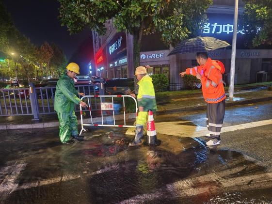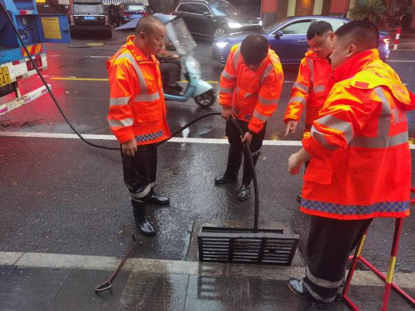 搶險現(xiàn)場,“高壓沖洗車+人工清掏”組合模式顯實效。針對15處嚴重堵塞點,高壓水槍精準沖擊管道淤積物,配合人工清理落葉雜物,排水效率提升40%。針對打開的25處雨水箅,搶險隊創(chuàng)新設(shè)置“雙層防護欄+反光警示牌+防爆警示燈”三重防護,并增派15名隊員配合交警實施交通管制,保障市民通行安全。