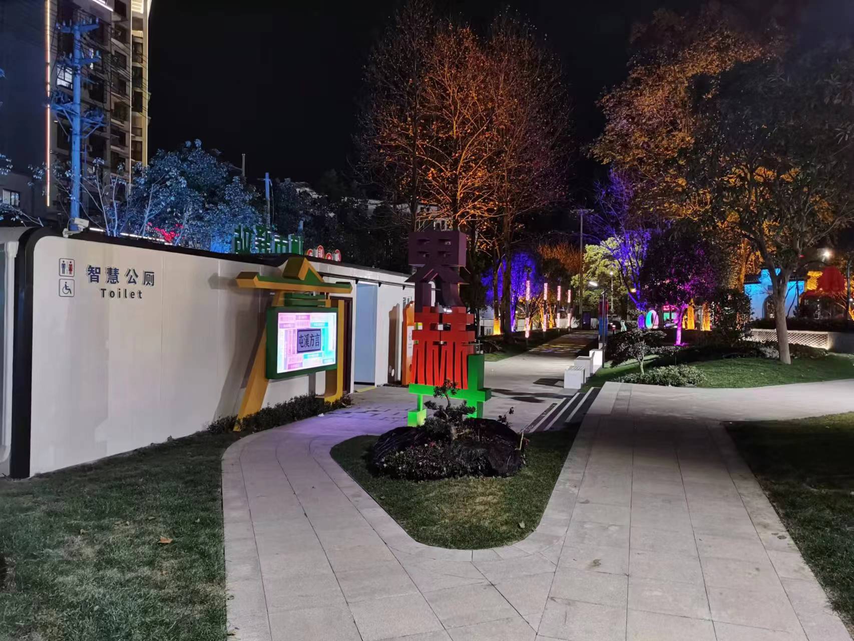 公園內(nèi)布置有健身活動(dòng)區(qū)及兒童游樂區(qū),新增了太陽能健身器材、無動(dòng)力單車、 七彩秋千、七彩蹺蹺板,修繕一新的景觀閑亭和長(zhǎng)廊為周圍居民提供休憩場(chǎng)地。園區(qū)內(nèi)還增設(shè)了智慧座椅和全市第一個(gè)裝配式智慧公廁,在打造智慧公園的同時(shí),為市民提供了直飲水、公廁、休憩空間等便民服務(wù)。夜間采用感應(yīng)花瓣燈、報(bào)樹燈、飄影燈、投影燈、草坪燈、霧森等燈光效果,對(duì)園路、擋墻進(jìn)行亮化布置,打造了游園夜間獨(dú)特景觀效果;綠化景觀以藍(lán)色“無盡夏”繡球花為主基調(diào),增加花境布置,在每年6-9月可呈現(xiàn)出一座美麗花園。